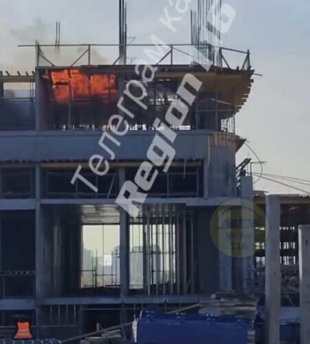 На кадрах видно, что яркие языки пламени охватили верхние этажи стройки.
