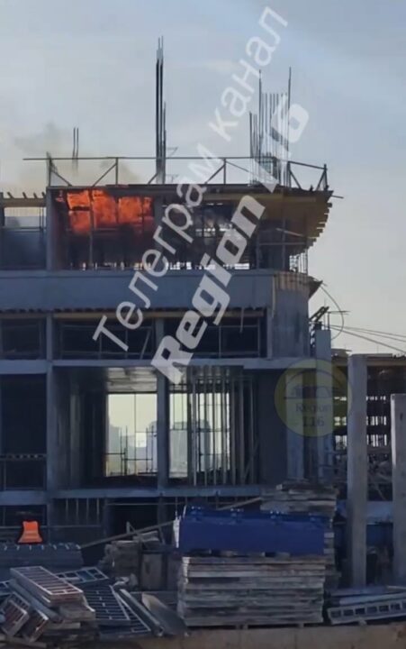На кадрах видно, что яркие языки пламени охватили верхние этажи стройки.