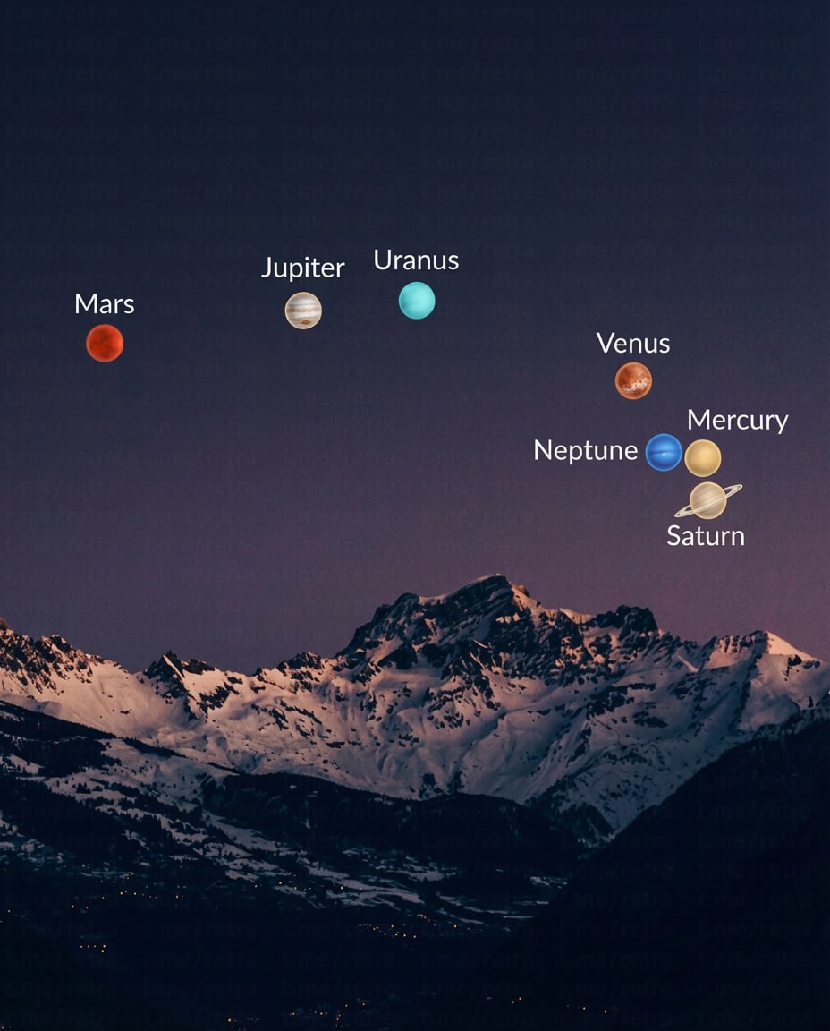 В один ряд выстроятся Меркурий, Венера, Юпитер, Сатурн, Уран и Нептун. К ним может присоединиться и Луна. Лучше всего наблюдать явление вечером, примерно через час после захода солнца.