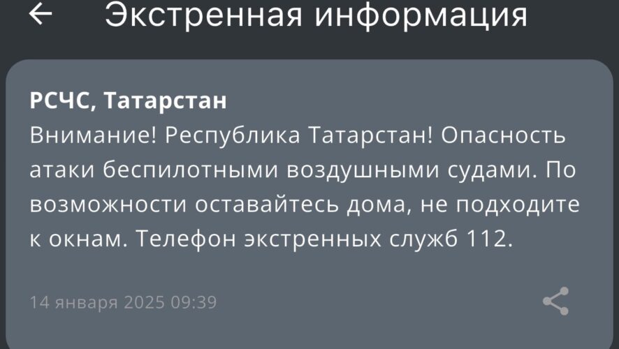 В 09:39 МЧС России разослала жителям Татарстана сообщение об опасности атаки беспилотниками.