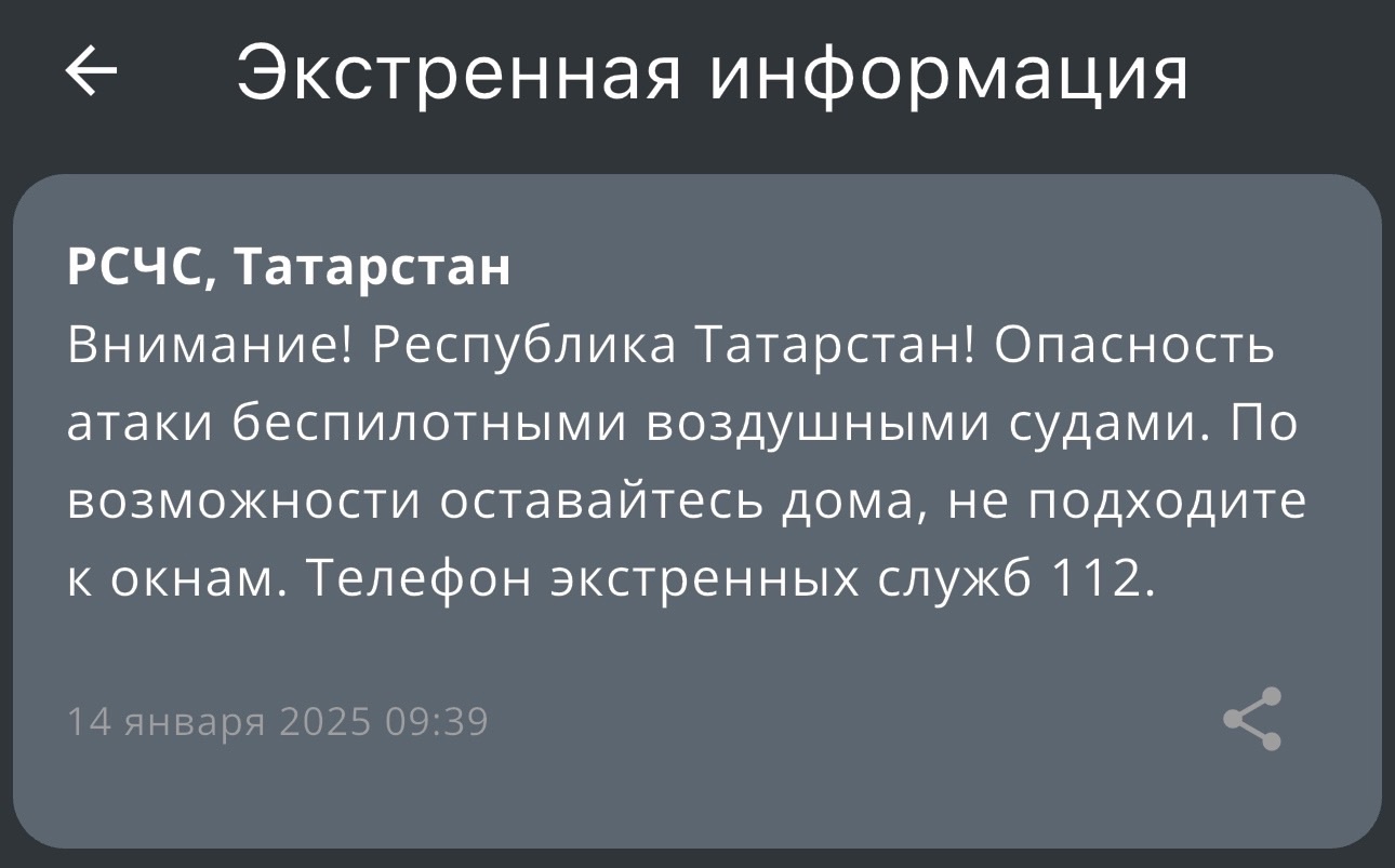 В 09:39 МЧС России разослала жителям Татарстана сообщение об опасности атаки беспилотниками.