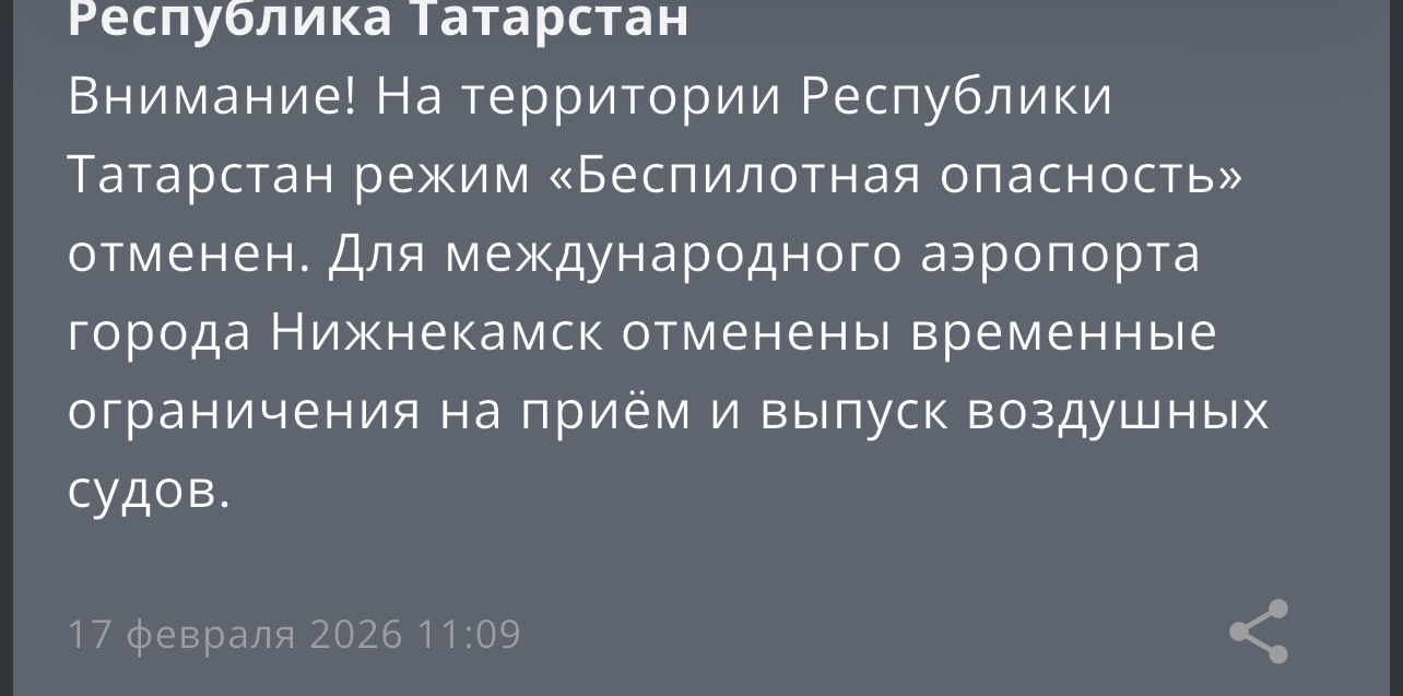 В Республике Татарстан отменили режим «Беспилотная опасность». Он действовал с 09:43. Режим действовал около полутора часов.