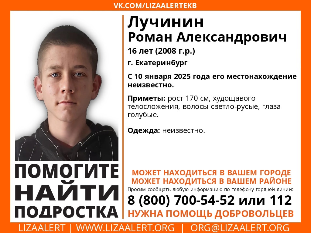 Местонахождение мальчика неизвестно с 10 января. Приметы 16-летнего Романа Лучинина следующие: рост — 170 см, худощавое телосложение, светло-русые волосы и голубые глаза.
