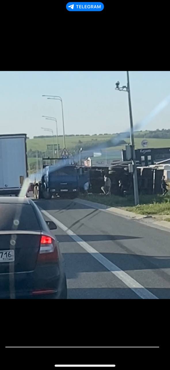 В Татарстане на трассе М7 перед деревней Эстачи большегруз завалился на бок. Очевидцы прислали видео KazanFirst.