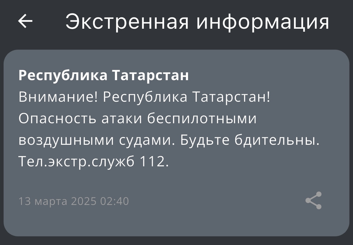 Сегодня, 13 марта, около половины третьего утра была объявлена угроза атаки беспилотными средствами. Об этом сообщило МЧС России.