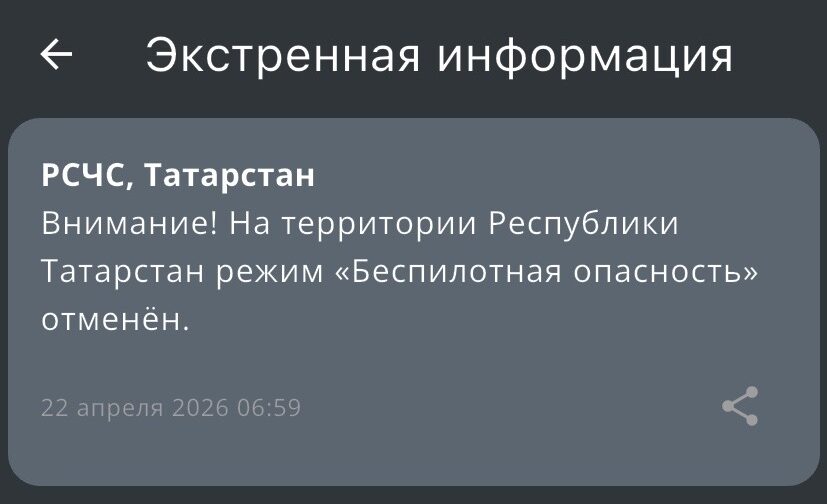 На территории Татарстана отменили режим беспилотной опасности. Об этом сообщает РСЧС.