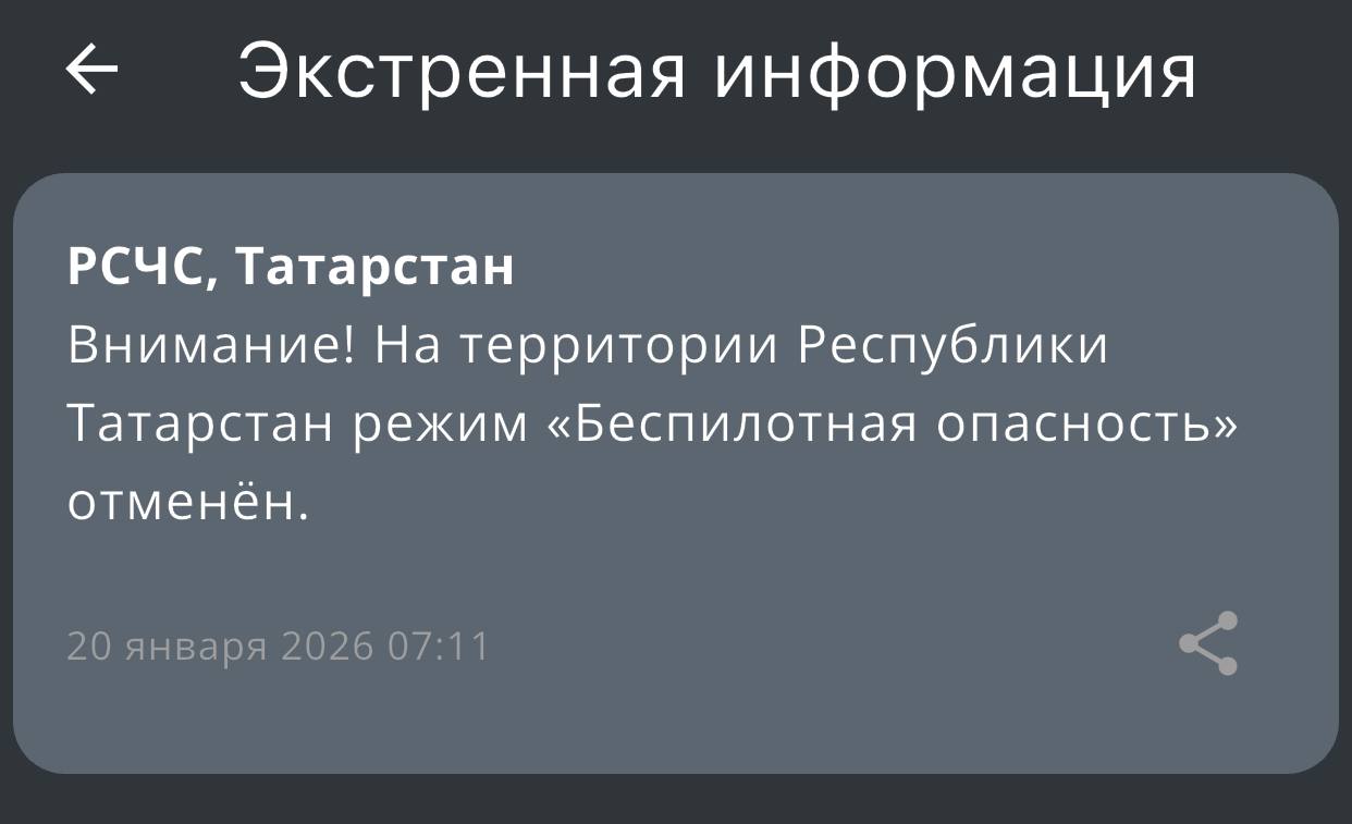 Режим «Беспилотная опасность» отменен в Татарстане. Об этом сообщает РСЧС.