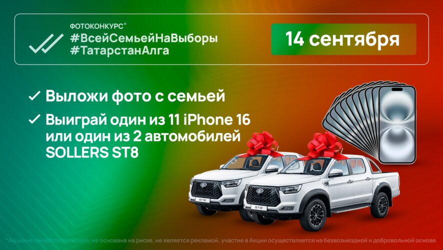 Завтра, 14 сентября, в День выборов раиса Татарстана пройдет масштабный фотоконкурс для всех семей республики. Организаторы приготовили впечатляющие призы: два внедорожника Sollers ST8, одиннадцать новых iPhone 16 и десять дополнительных подарков, включая роботы-пылесосы, аэрогрили и отпариватели.
