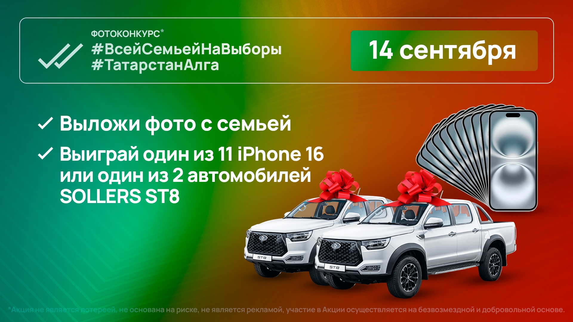 Завтра, 14 сентября, в День выборов раиса Татарстана пройдет масштабный фотоконкурс для всех семей республики. Организаторы приготовили впечатляющие призы: два внедорожника Sollers ST8, одиннадцать новых iPhone 16 и десять дополнительных подарков, включая роботы-пылесосы, аэрогрили и отпариватели.
