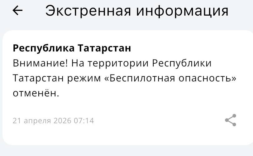 На территории Республики Татарстан сняли режим беспилотной опасности, об этом сообщает РСЧС.