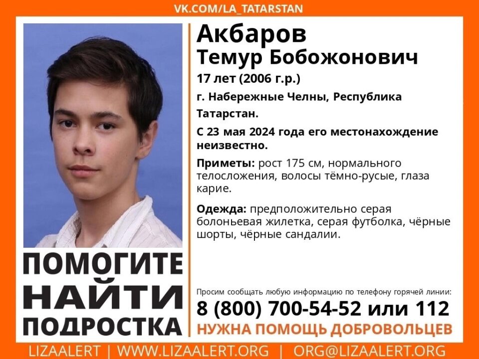 В Набережных Челнах третью неделю ищут пропавшего подростка. 17-летнего Темура Акбарова в последний раз видели 23 мая. Об этом сообщили в поисково-спасательном отряде «ЛизаАлерт».