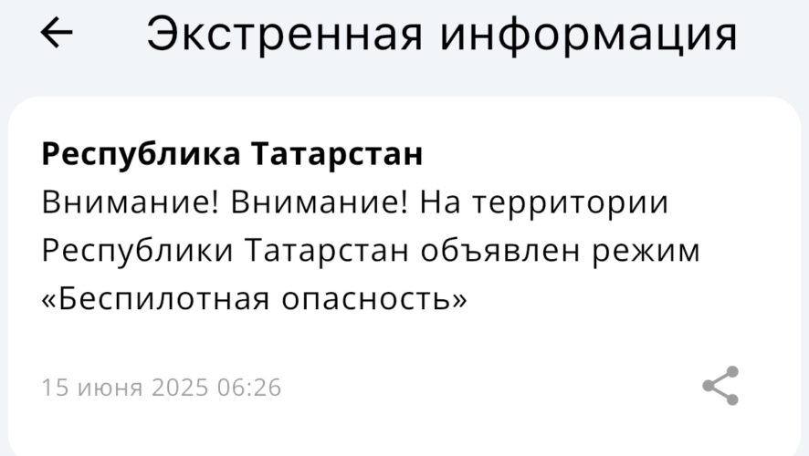«Внимание! Внимание! На территории Республики Татарстан объявлен режим «Беспилотная опасность». Будьте внимательны», — говорится в сообщении.