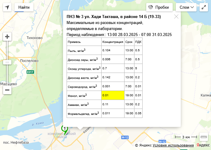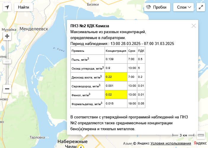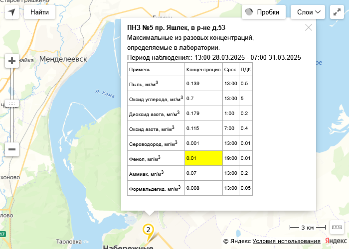Речь идет о пунктах около парка «Гренада» на улице 40 лет Победы и у Дворца культуры «КАМАЗ» на проспекте Мира. В первом случае показатель при допустимой норме в 0,2 мг/м3 составил 0,218. Во втором — 0,22. При этом у ДК зафиксировали также превышение по фенолу. Речь идет о 0,02 мг/м3. Предельно допустимое значение — 0,01.