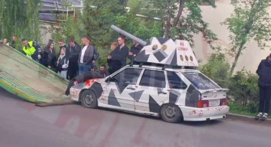 Машина привлекла внимание не только патриотическим тюнингом — декоративной «пушкой» и соответствующими символами, но и инсталляцией, имитирующей окровавленное тело на капоте. Автомобиль был заметно занижен и имел тонированные стекла.