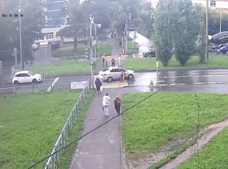 На кадрах видно, что велосипедист проезжал на красный свет по пешеходному переходу. В этот момент легковушка уже начала движение и не смогла вовремя остановиться. Чтобы избежать столкновения, водитель авто перестроился на другую полосу, но избежать столкновения не удалось.