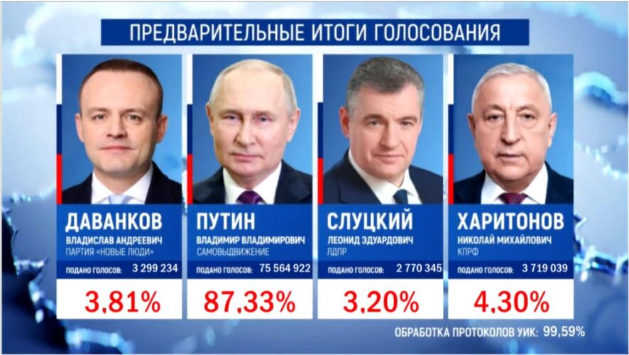По данным Центральной избирательной комиссии, после обработки 99,59% протоколов на выборах Президента России лидирует действующий глава государства Владимир Путин. Он получил 87,33% голосов.