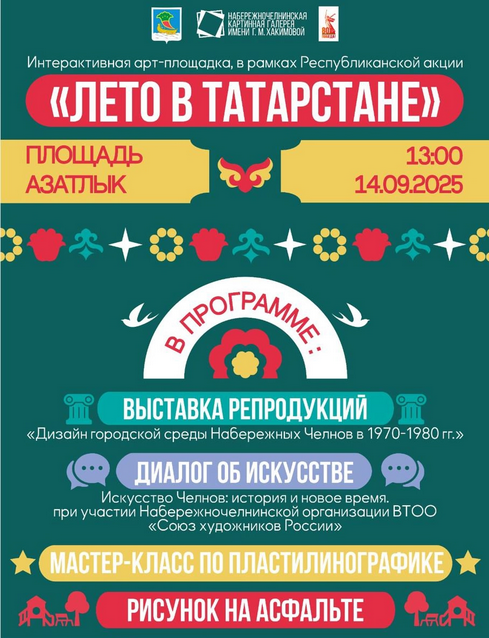 Так, в 12:00 классические и современные патриотические композиции под звуки духового оркестра исполнят юные таланты Детской музыкальной школы №6 имени Сайдашева. Через час на площади развернется интерактивная арт-площадка от Картинной галереи. Пришедшие смогут увидеть выставку репродукций «Дизайн городской среды Набережных Челнов в 1970-1980 годы», поучаствовать в мастер-классе и присоединиться к диалогу об искусстве с членами Союза художников России.