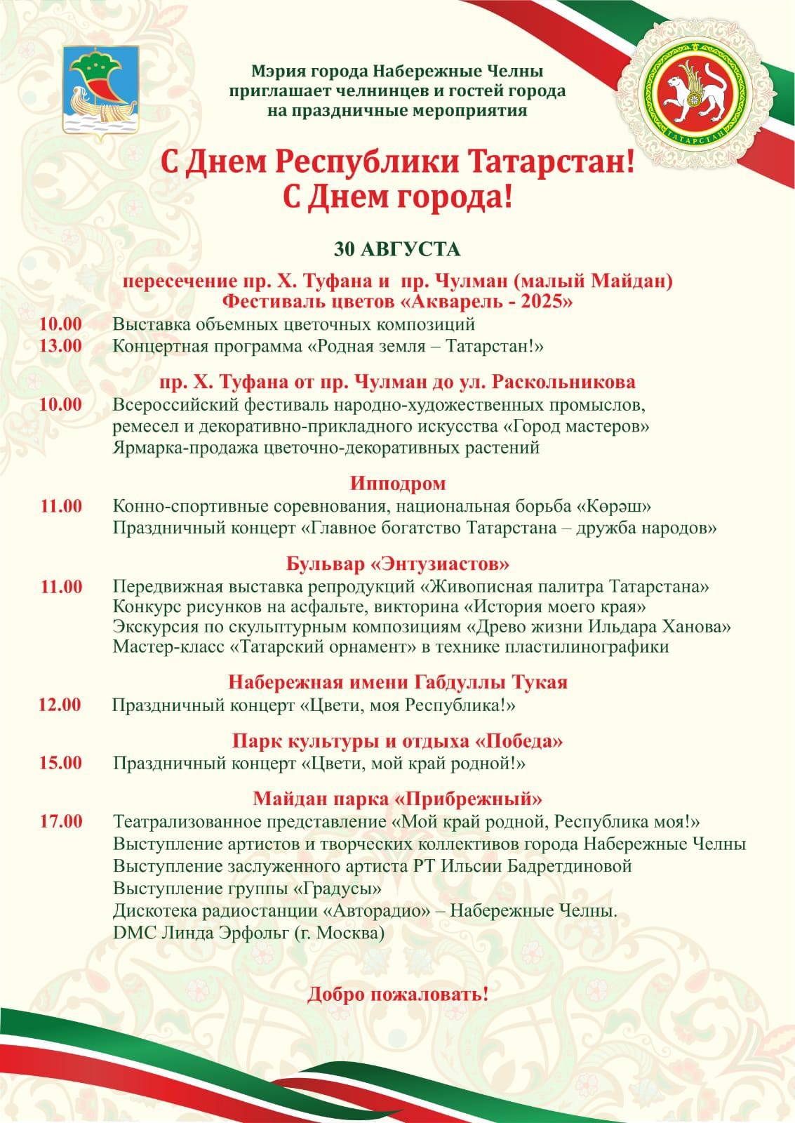 Программу празднования Дня республики, который в Набережных Челнах отметят 30 августа, опубликовали чиновники автограда. Мероприятия организуют на Майдане, ипподроме, набережной Тукая и в парке Победы. Они стартуют в 10:00 с фестиваля цветов «Акварель – 2025».