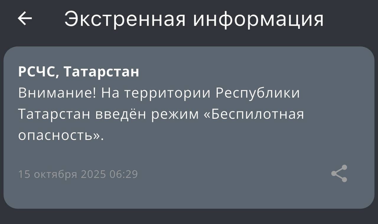В Татарстане вновь объявили режим беспилотной опасности. Сообщение поступило от МЧС России в 6:29.