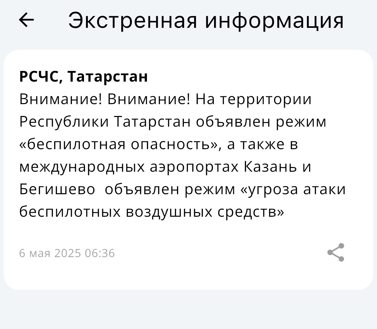 В 6:40 в Татарстане объявлен режим «Беспилотная опасность». Соответсвующее сообщение пришло от МЧС.