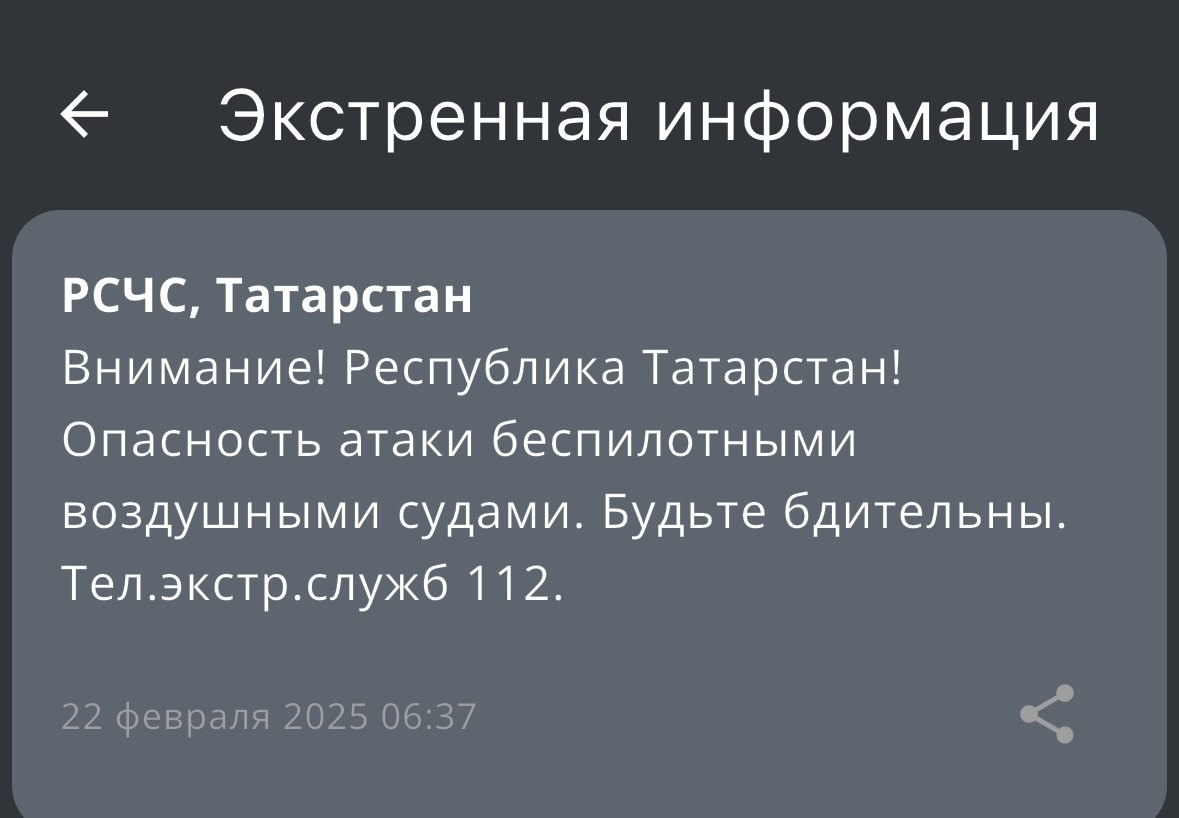Угрозу опасности атаки БПЛА в Татарстане объявило МЧС России. Соответствующее оповещение пришло в 6:37 утра в субботу, 22 февраля.