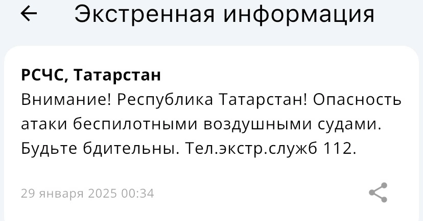 Опасность атаки беспилотными воздушными средствами объявлена в Татарстане. Такое сообщение пришло ночью от МЧС России.