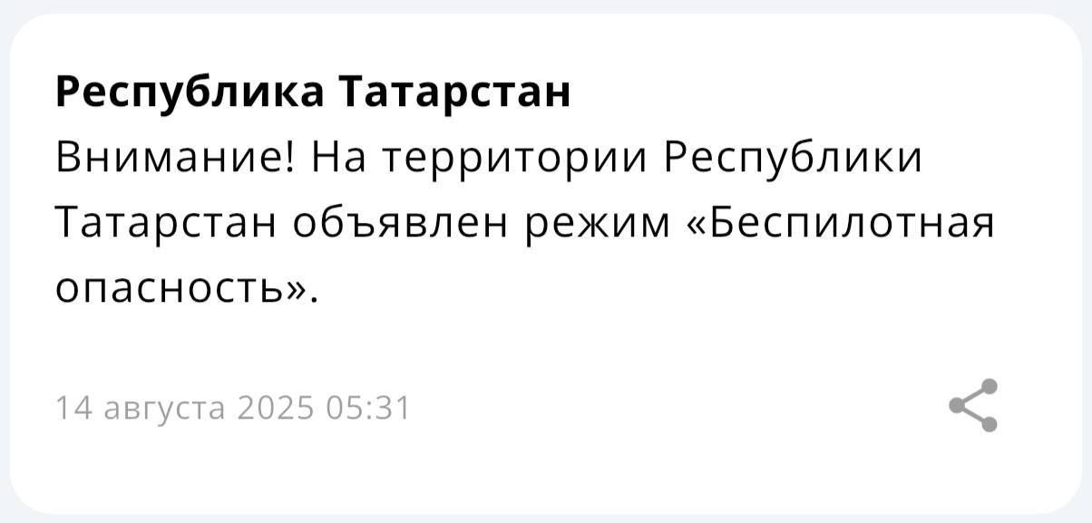 Рано утром на территории Республики Татарстан был вновь объявлен режим «Беспилотная опасность». Сообщение от МЧС России пришло около половины шестого утра.