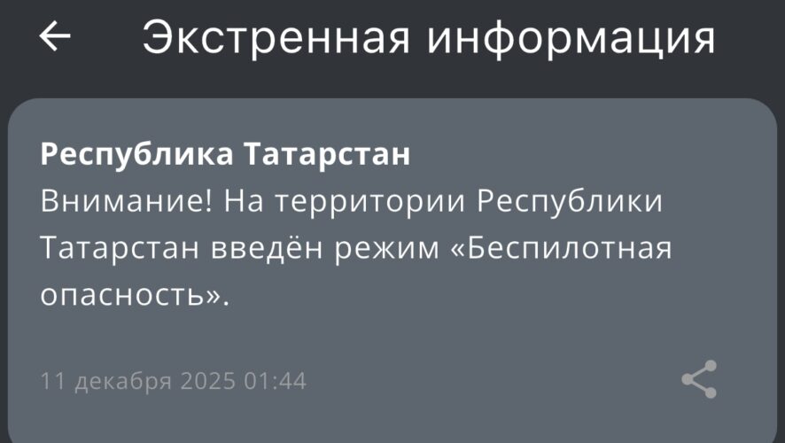 Режим беспилотной опасности вот у же пятый час действует в Татарстане. Сообщение с предупреждением от МЧС России поступило с 01.44.