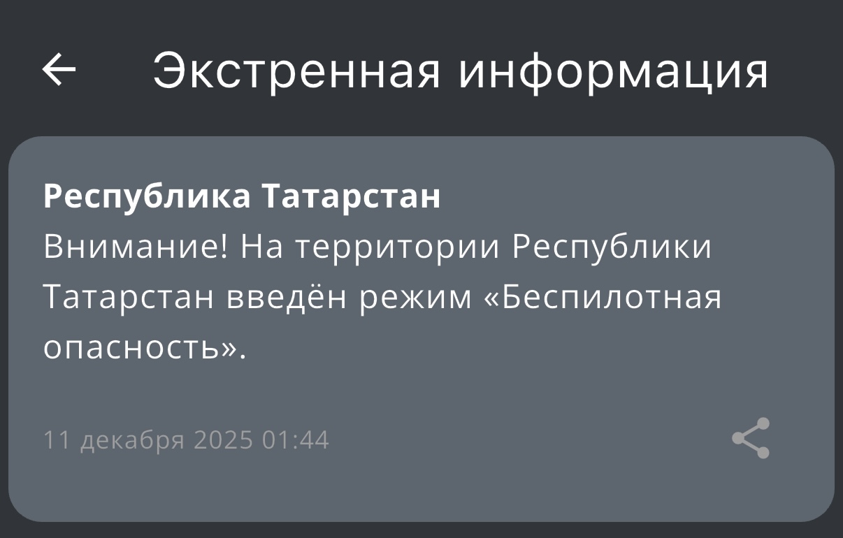 Режим беспилотной опасности вот у же пятый час действует в Татарстане. Сообщение с предупреждением от МЧС России поступило с 01.44.