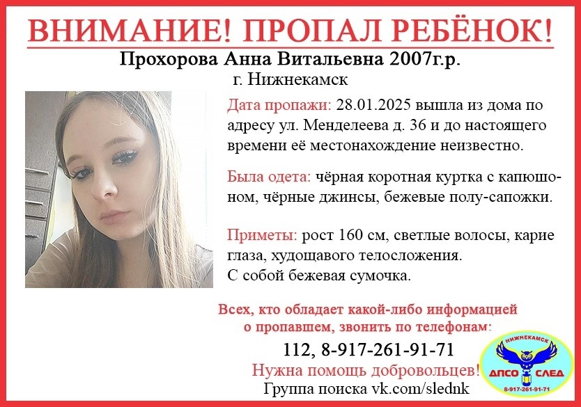 В Нижнекамске с 28 января ведутся поиски 17-летней девочки-подростка. Соответствующая ориентировка появилась на странице ДПСО «След».