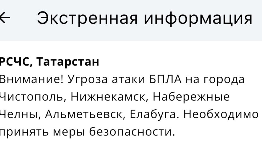 Угроза атаки вражеских БПЛА объявлена сразу в пяти городах Татарстана. Под возможный удар попадают Чистополь, Набережные Челны, Нижнекамск, Альметьевск и Елабуга. Сообщение об этом поступило от МЧС России.