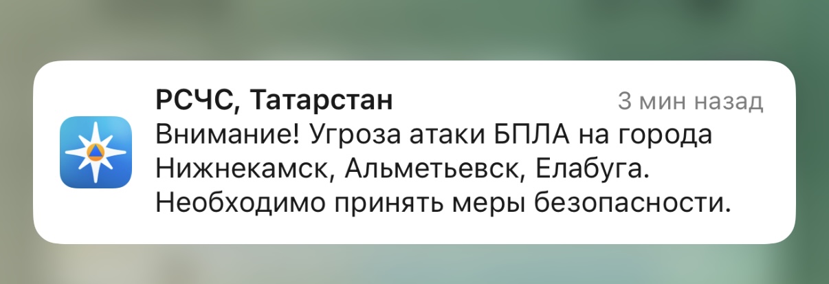 Ближе к пяти утра поступило предупреждение об угрозе атаки дронами сразу по трем республиканским городам — Нижнекамску, Альметьевску и Елабуге. Татарстанцам и гостям РТ стоит принять меры безопасности, спуститься в укрытия (подвалы или паркинги).