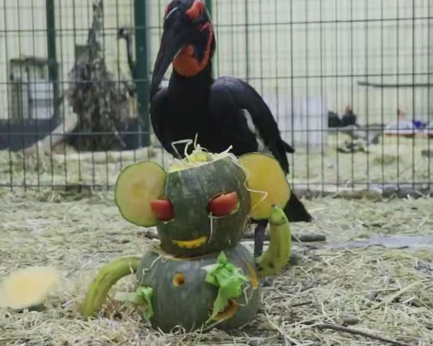 Сотрудники зоопарка создали для питомицы оригинальное угощение: тело культового персонажа сделали из тыквы, руки — из бананов, а глаза — из долек помидоров.