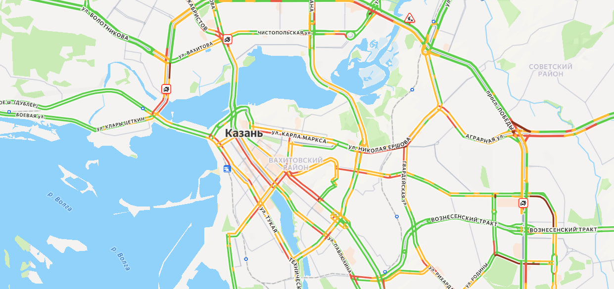 Согласно данным сервиса, самые большие заторы собрались в центре города – в Вахитовском районе, а также в Авиастроительном и Советском районах. В Приволжском, Московском и Кировском и Ново-Савиновском районах ситуация обстоит проще.