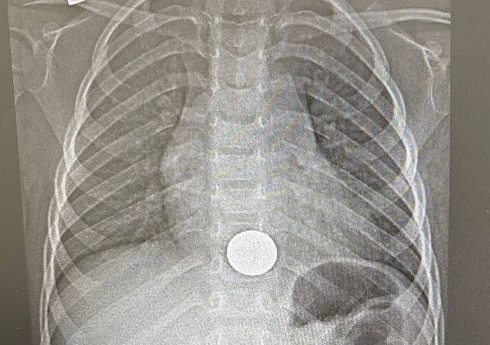 Ребенок поступил в больницу с жалобами на боли за грудиной. Как выяснилось, мальчик взял поиграть монету у старшего брата и случайно ее проглотил. О случившемся он сразу рассказал родителям. Мама оперативно доставила сына в медучреждение. После рентгенологического обследования опасения подтвердились: монетка была в пищеводе.