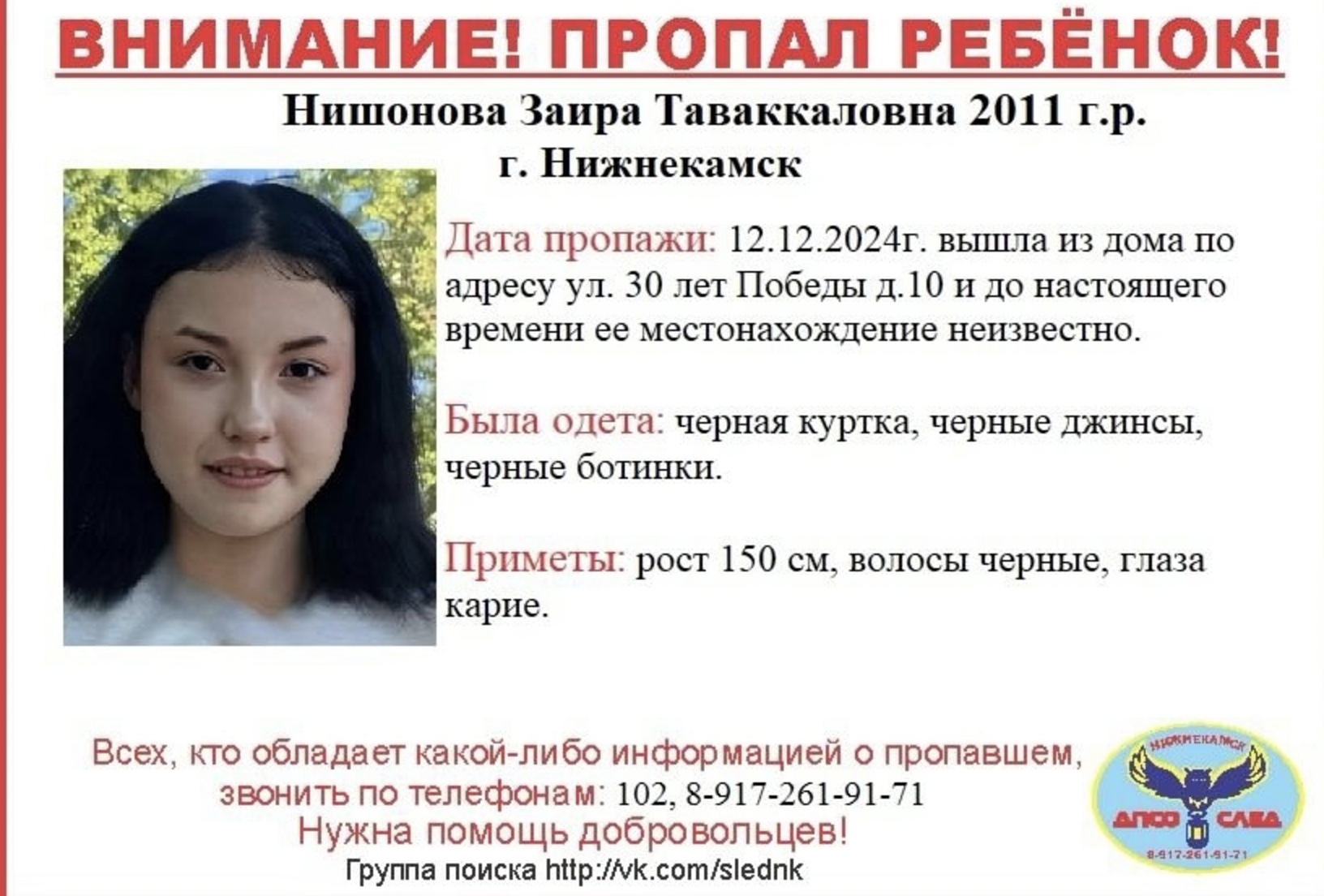 В Нижнекамске вторую неделю ищут пропавшую 13-летнюю девочку. Заира Нишонова пропала 12 декабря — девочка вышла из дома на улице проспект Победы, 10 и не вернулась.
