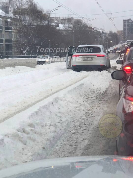Водитель белоснежного внедорожника рискнул проехать по трамвайным путям. Однако либо клиренс авто подвёл, либо навыки водителя, но премиум-внедорожник крепко застрял в снежной каше, перекрыв проезд трамваям.