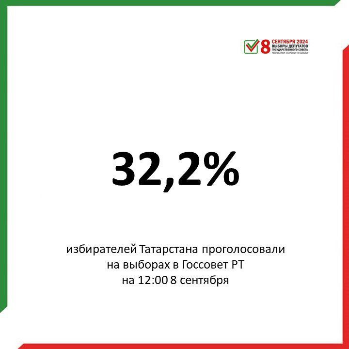К полудню явка на выборы в Госсовет Татарстана составила 32,2%. Об этом сообщает система ГАС «Выборы».