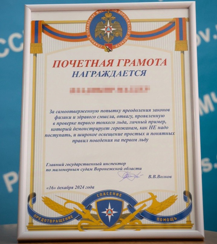 Фотограф-фрилансер Владимир Малдер, известный своими экстремальными видеороликами, получил почётную грамоту от регионального МЧС России по Воронежской области.