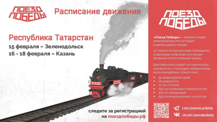 К 23 февраля первая в мире иммерсивная передвижная выставка «Поезд Победы» прибудет в Республику Татарстан. Жители Зеленодольска смогут посетить ее 15 февраля, а с 16 по 18 февраля выставка будет работать в Казани.