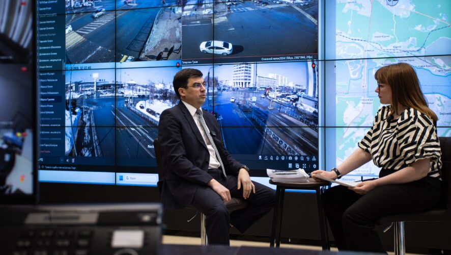 — Мы специально выбрали это место для интервью, потому что АСУДД — это центр управления дорожным движением города. Это система, которая координирует работу светофоров и камер, обеспечивая более равномерное движение транспорта. Она была создана при подготовке к Универсиаде, и уже тогда вложения составили более 1 млрд рублей. Это позволило увеличить пропускную способность дорог примерно на 15%.![]()