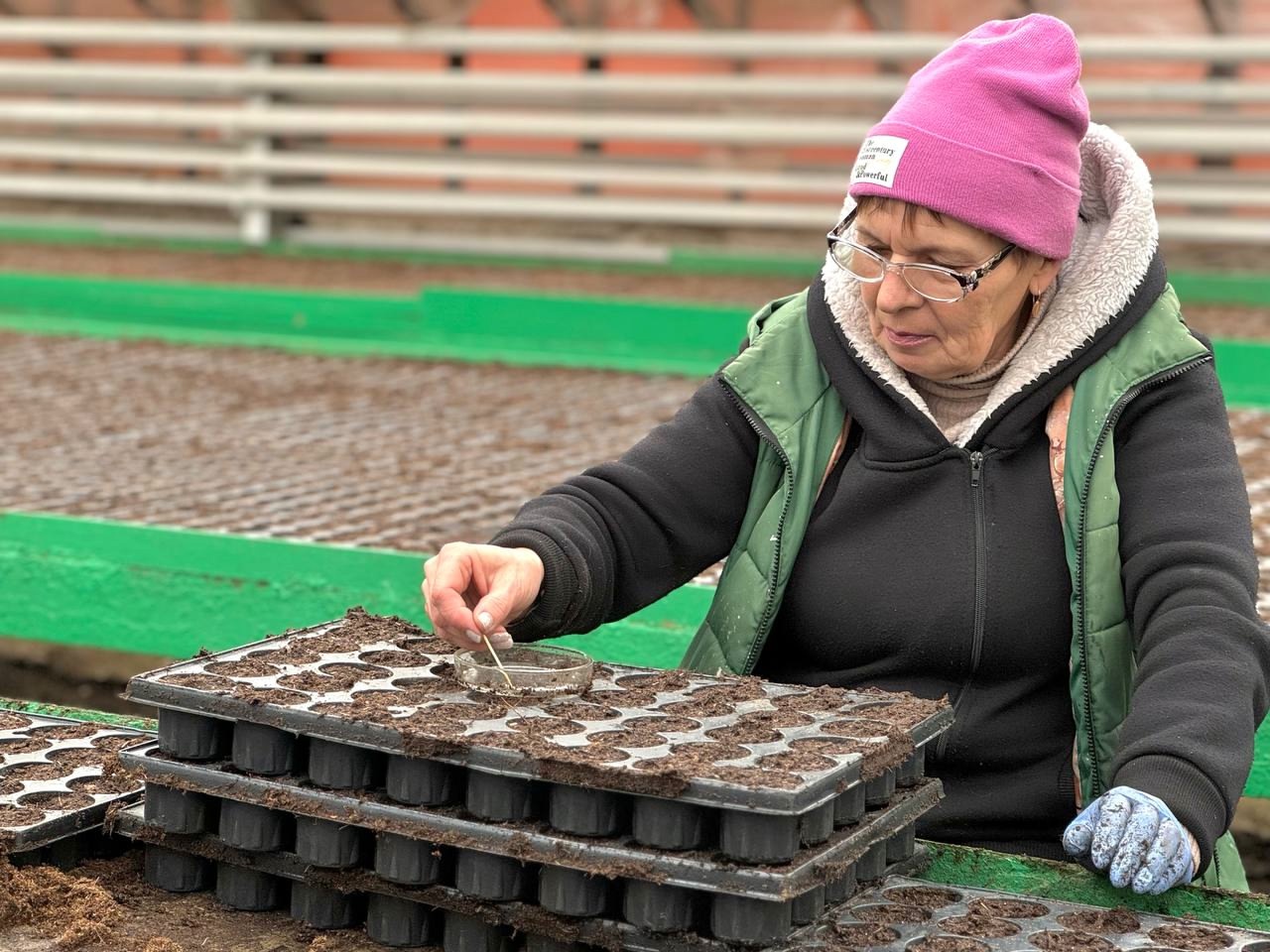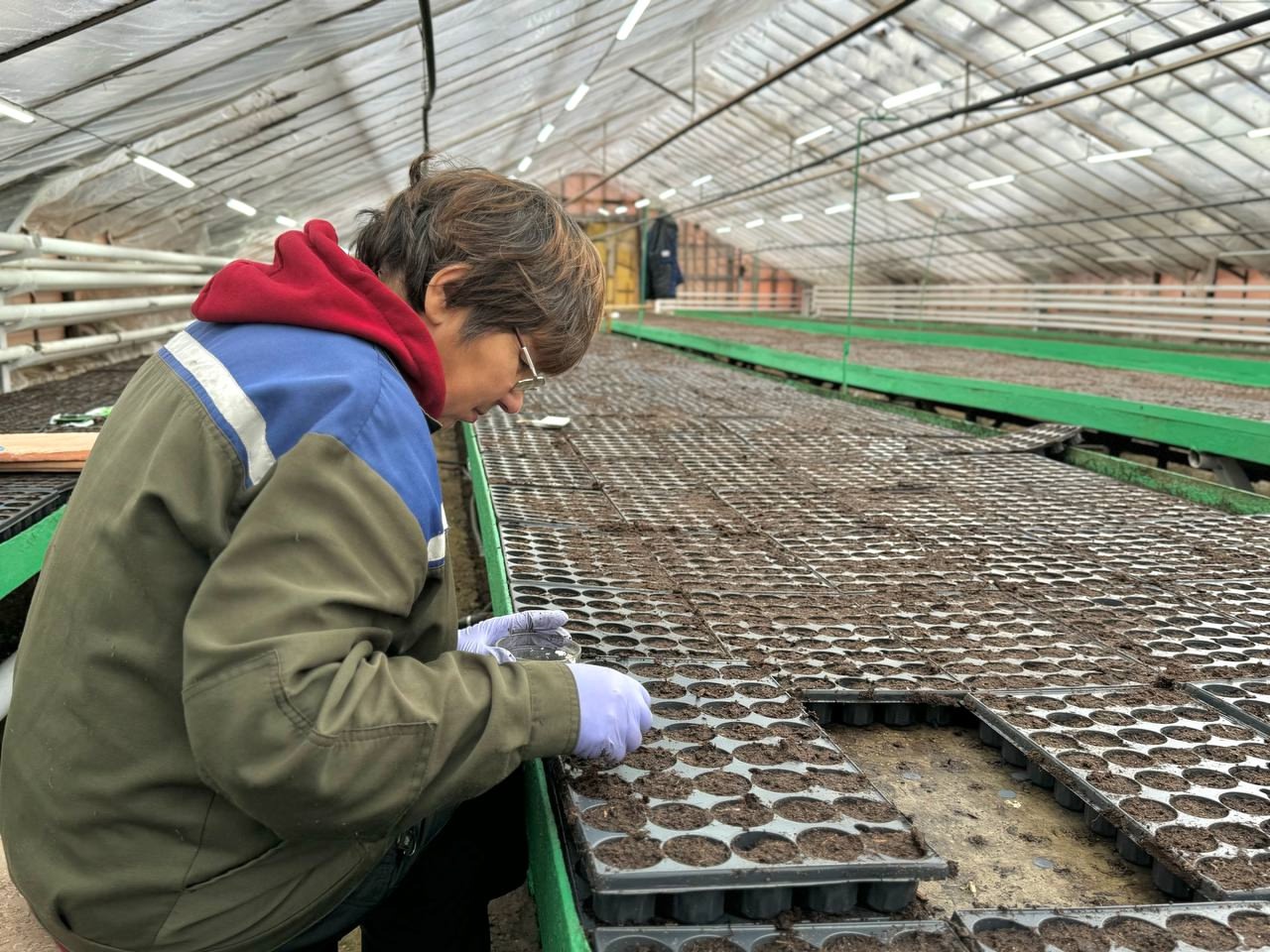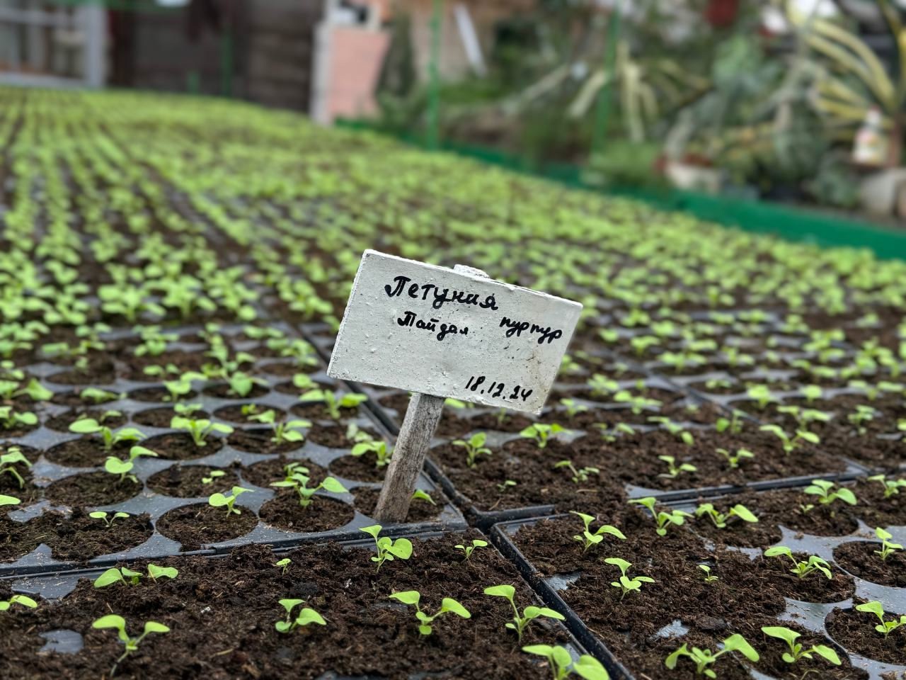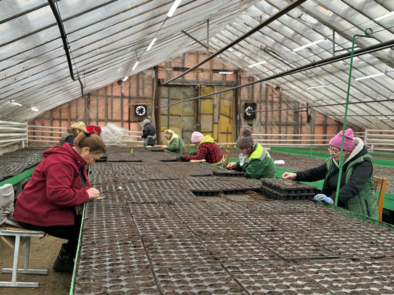 Сейчас над рассадой трудятся 14 работников. Они выращивают цветы в теплицах на территории в один га.