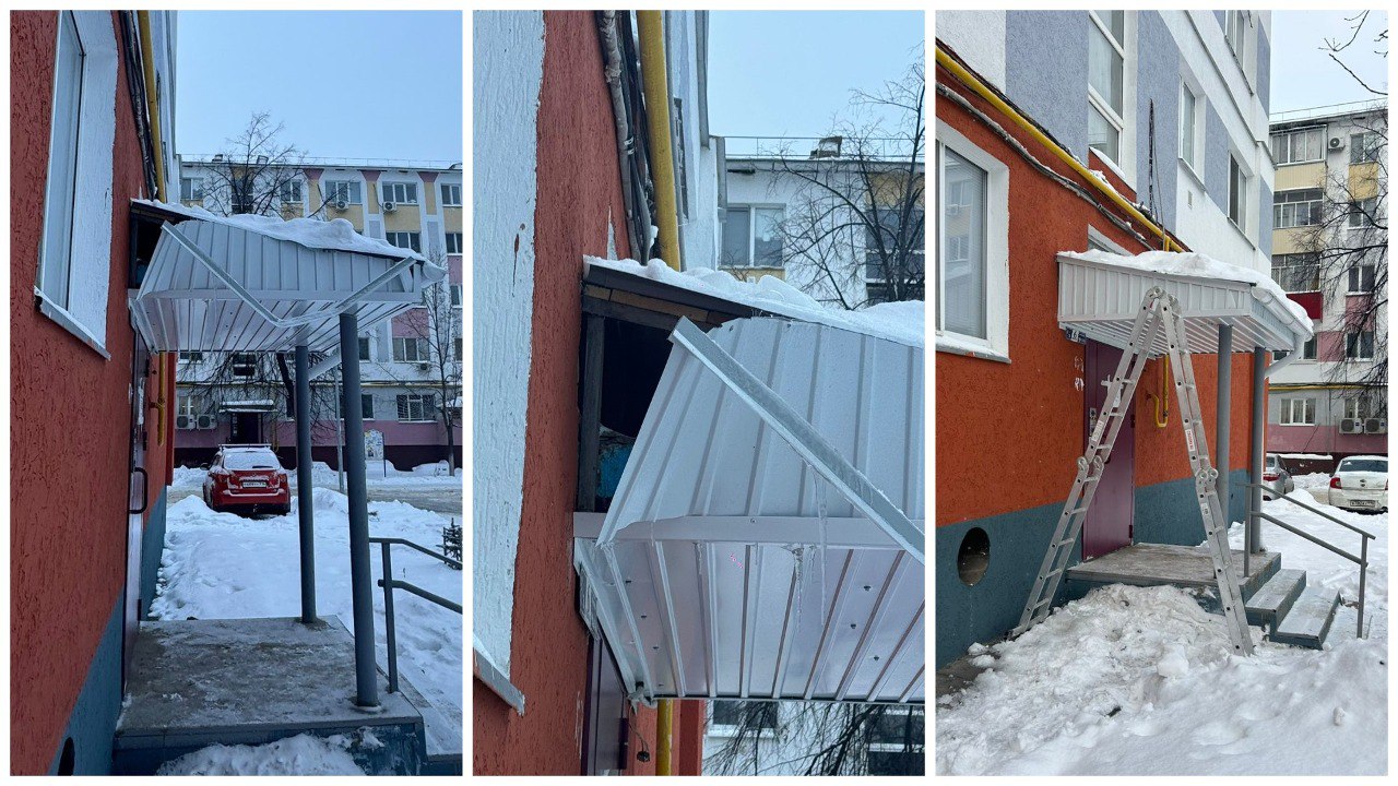 В Набережных Челнах после жалоб горожан сотрудники Жилинспекции Татарстана выехали с визитом к дому 2/3 в поселке ГЭС. Жительница автограда рассказала, что во время очистки кровли снежная глыба повредила козырек над подъездом.