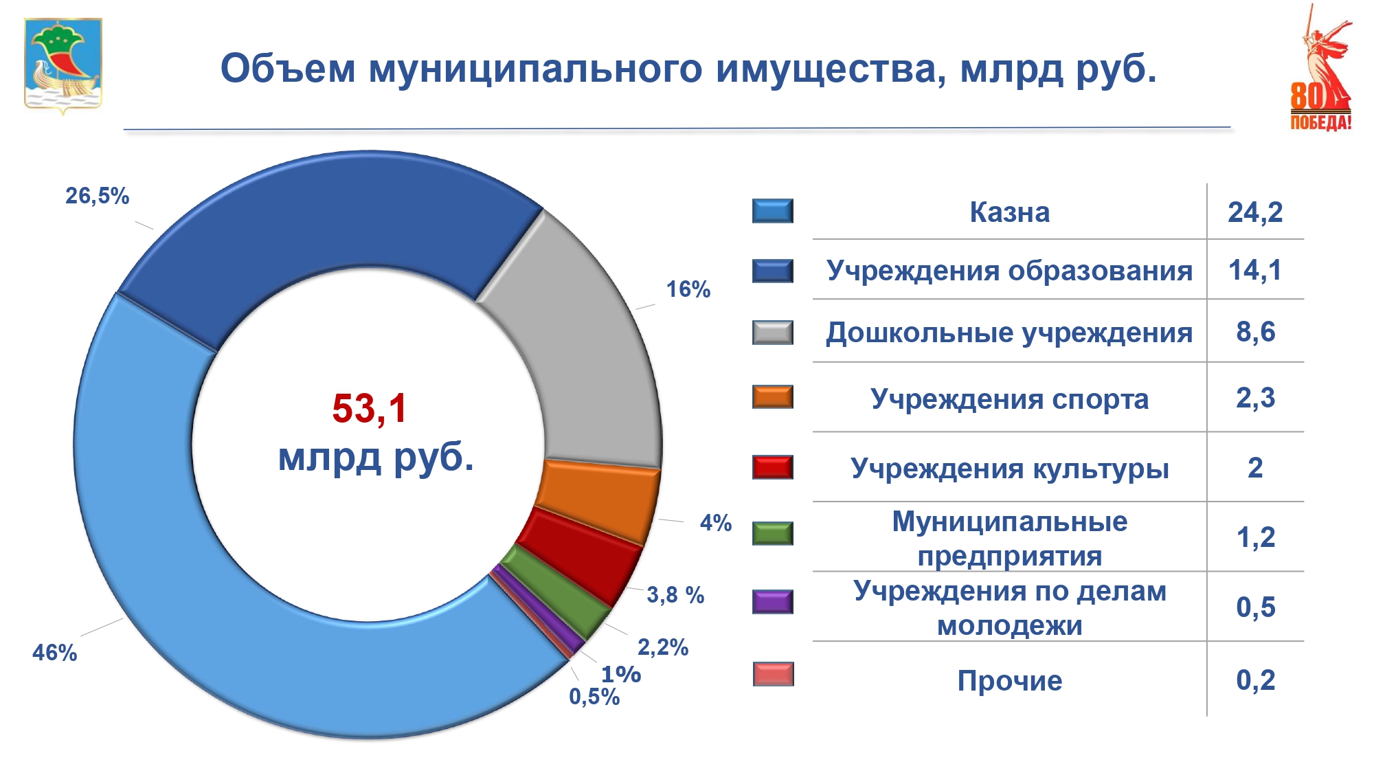 Физкультурно-оздоровительный комплекс «Центр спорта «ФИЗРА», объездную дорогу под мостом Мелекески, магистральную улицу в продолжение проспекта Московский, переход через реку Челна приняли в муниципальную собственность в автограде. Объем имущества на 1 января 2025 года составляет 53,1 миллиарда рублей. Из собственности Татарстана, а также в результате безвозмездной передачи от сторонних организаций в Челнах приняли имущество на 10,6 миллиарда.