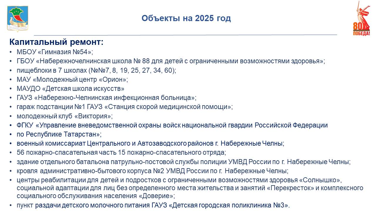 В планах на 2025 год обновление зданий отдельного батальона патрульно-постовой службы полиции и управления вневедомственной охраны войск нацгвардии России по Татарстану; помещения пункта раздачи молочного питания детской городской поликлиники №3, военного комиссариата Центрального и Автозаводского районов и двух центров: реабилитационного для детей и подростков с ограниченными возможностями «Солнышко», социальной адаптации для бездомных «Перекресток». Кроме того, отремонтируют молодежный клуб «Виктория», кровли объектов, где находятся 56 пожарно-спасательная часть и административно-бытовой корпус №2 УМВД.