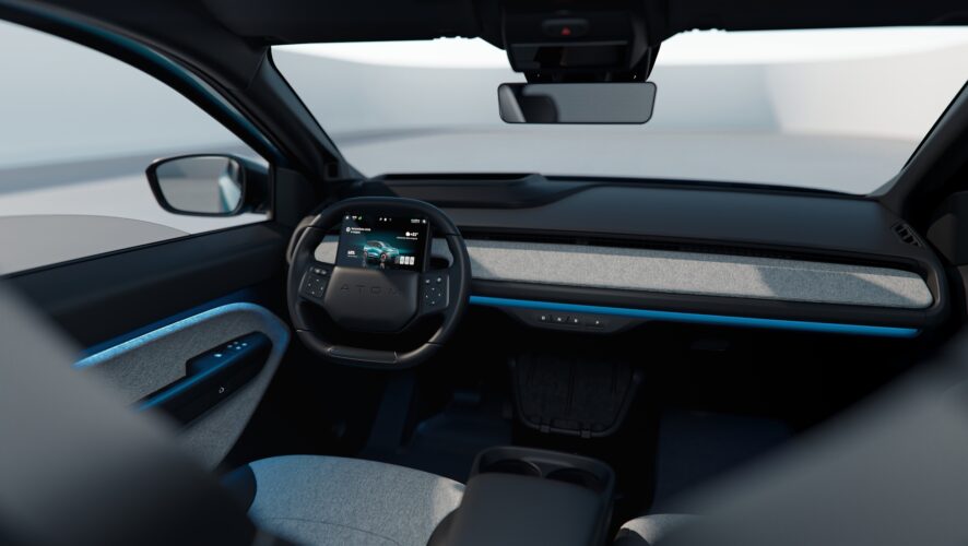 Салон «Атома» представлен в темном и светлом цветовых решениях. Для внутренней отделки использовали экокожу. На передней панели электромобиля есть кнопки переключения режимов движения, дефлектор климат-контроля и перчаточный ящик. Снизу — полка для смартфонов с беспроводной зарядкой Qi и двумя разъемами Type-C. На руле, оснащенном обогревом, установили сенсорный экран и физические переключатели.