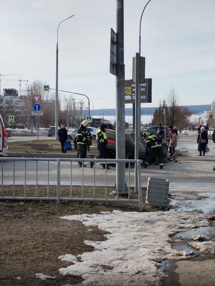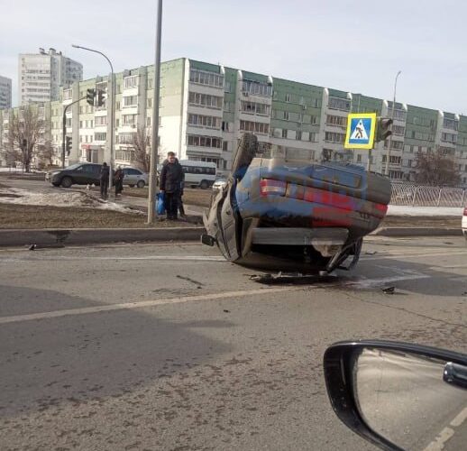Легковушка перевернулась на проезжей части в Набережных Челнах. Очевидцы поделились в соцсетях фото с места происшествия.