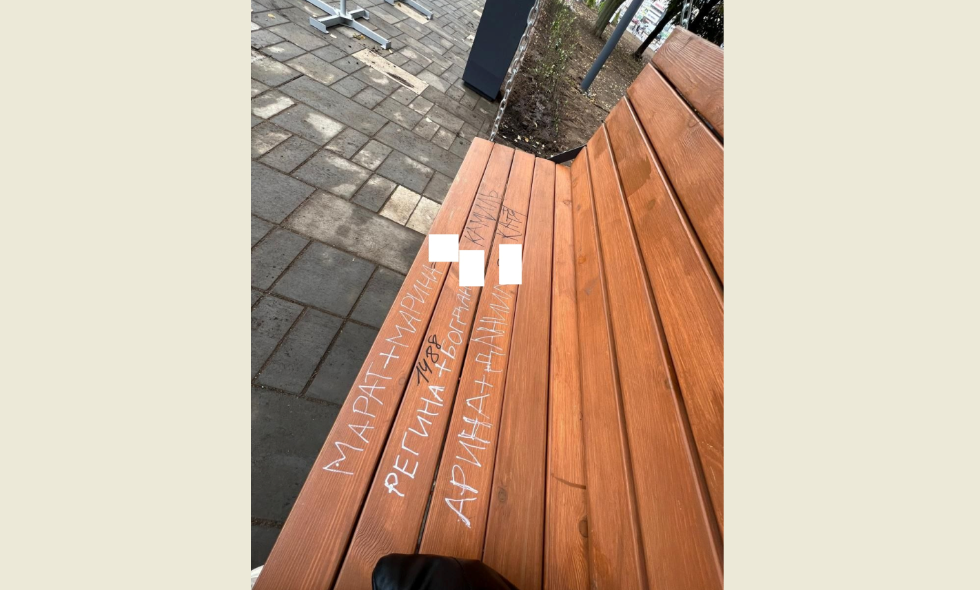 На новых скамейках «красуются» надписи: «Марат + Марина», «Регина + Богдан» и другие в подобном духе.