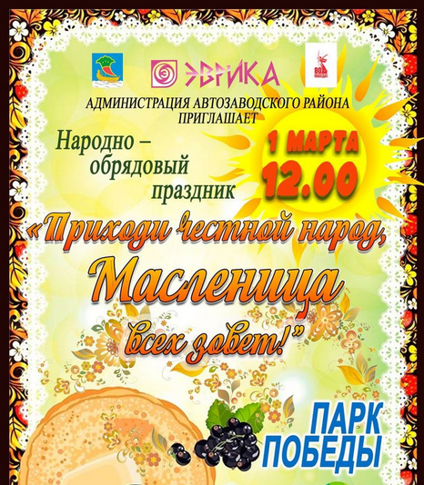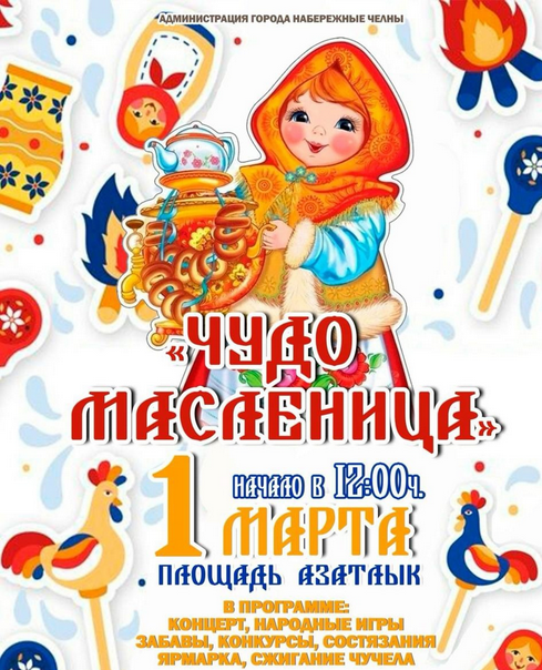 На трех площадках Набережных Челнов будут отмечать Масленицу 1 марта. Праздничные мероприятия развернутся перед мэрией на площади Азатлык, в двух парках: Победы, а также Культуры и отдыха. Начало в 12:00.
