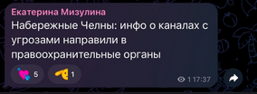 «Набережные Челны: инфо о каналах с угрозами направили в правоохранительные органы», — написала Мизулина (орфография и пунктуация автора сохранены).
